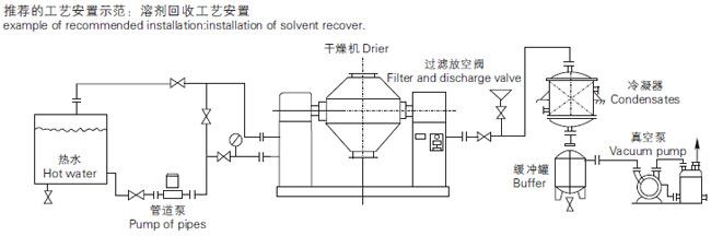 The raw material exists is under vacuum. The drop of steam pressure makes the moisture (solvent) at the surface of raw material become saturation and will evaporate. The solvent will be discharged through vacuum pump an recovered in time. The inner moisture (solvent) of raw material will infiltrate, evaporate and discharge continuously. The three processes are carried out unceasingly and the purpose of drying can be realized within a short time.