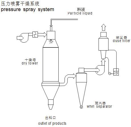 The material is sprayed into exiguity fog by nozzle on the top of tower. Follow the heat wind, the material is dried. The machine's characteristic is high collect drit, no past, economizing energy, high effect, and wide used in food, dyestuff, chemical industry and so on.