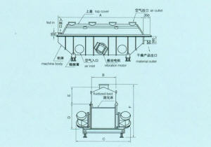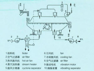 物料自進料口進入機內(nèi),在振動力作用下, 物料沿水平方向拋擲向前連續(xù)運動,熱風向上穿過流化床和濕物料換熱,濕空氣經(jīng)旋風分離器除塵后由排風口排出,干燥物料由排料口排出。